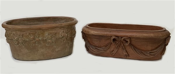 Manifattura fiorentina, lotto di due fioriere ovali in terracotta decorate con fasce in rilievo a frutti e fiocchi (cm 80x27x40 e cm 69x32x48) (difetti)
