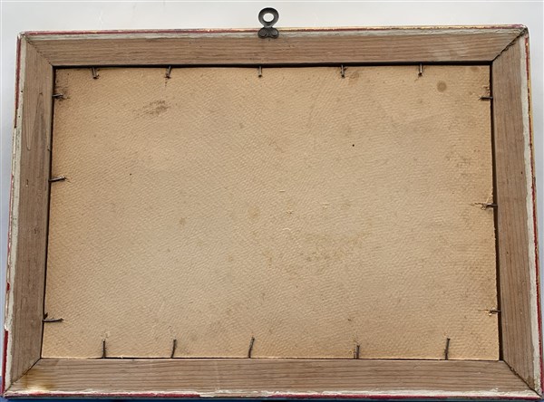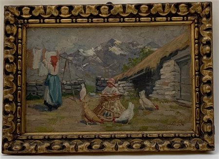 Firma indecifrata "In cortile" olio su compensato (cm 30x20) Firmato in basso a destra. In cornice