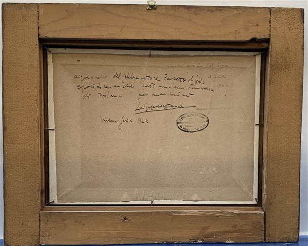 "Vecchie Case in Val Leogra" 1924, acquerello su cartone (cm 38x28) Firmato in basso a destra. Al retro: firmato, datato e titolato. In cornice