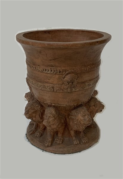 Manifattura fiorentina, fioriera in terracotta con base decorata da teoria di leoni (h cm 47, d cm 40) (difetti)