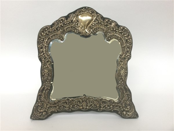 Specchio da tavolo inglese di forma sagomata con cornice in argento sbalzato a volute e motivi vegetali e fiori (cm 39x38) (lievi difetti)