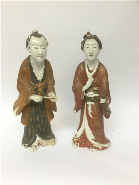 Manifattura giapponese sec.XX, coppia di figure in porcellana dipinta, marcate alla base (difetti e mancanze)