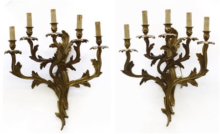 Coppia di applique in bronzo dorato a cinque fiamme con decoro a motivo fogliaceo (h cm 56) (difetti)
