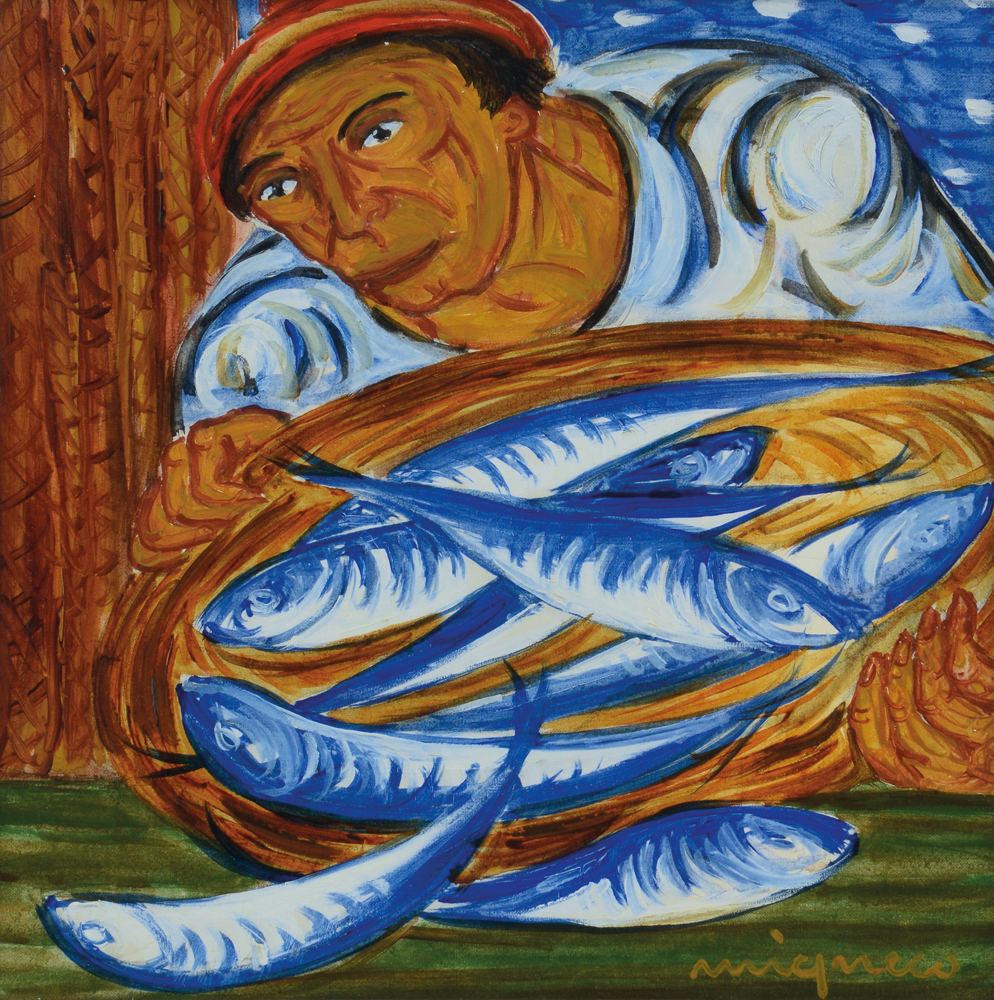 GIUSEPPE MIGNECO Messina 09/02/1908 - Milano 28/02/1997  Pescatore, 1986 olio su tela cm. 30x30, firma in basso a destra, autentica dell'artista e timbro con archivio della Galleria Bonaparte (MI) al retro, opera registrata presso l'archivio Giuseppe Migneco come da dichiarazione su foto, pubblicato su "Migneco, Catalogo generale" volume IV, Buonaparte Editrice (MI), a cura di Nicola Carlo Luciani, pagina 332, rep. numero 3837.