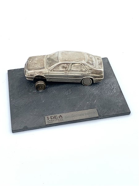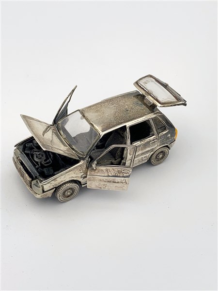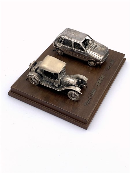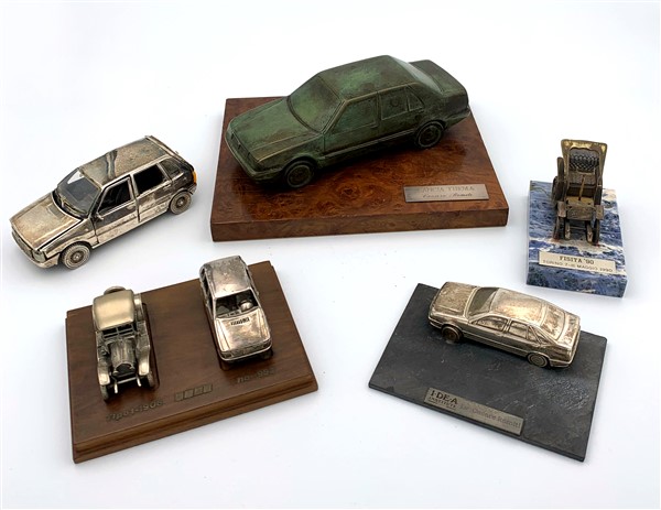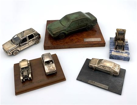 Cinque modellini di auto Fiat e una Lancia in argento,metallo e metallo argentato (misure diverse) (difetti)