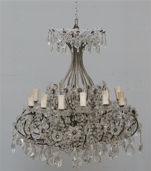 Lampadario a dodici luci con struttura in metallo decorato con fili di perline e pendagli in cristallo sfaccettato (d cm 90) (difetti e mancanze)