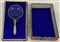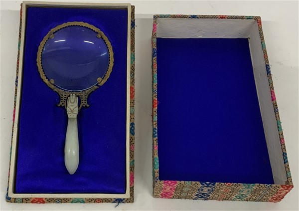 Manifattura cinese, lente d'ingrandimento in metallo parzialmente dorato, manico con antica fibia in giada celadon, con scatola (difetti)
