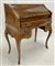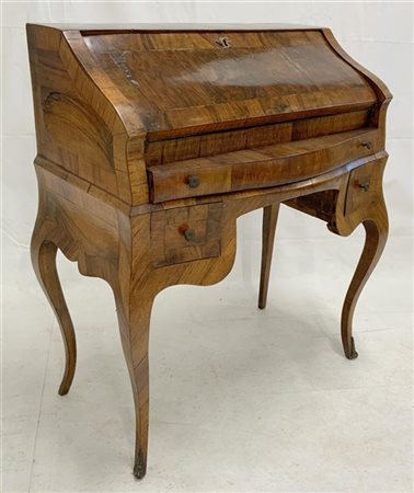 Ribalta di forma mossa lastronata in noce con calatoia celante tiretti, un cassetto sopra altri due più piccoli (cm 83x93x43) (difetti)