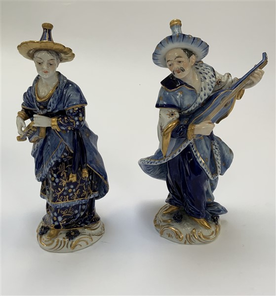 Manifattura del secolo XX, coppia di figure in porcellana raffiguranti suonator