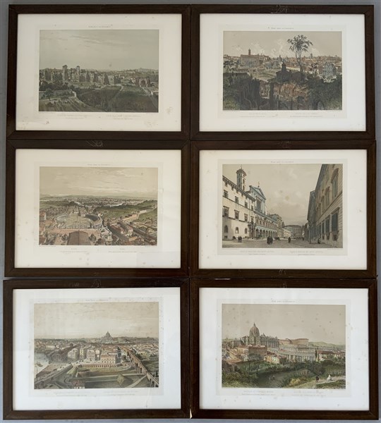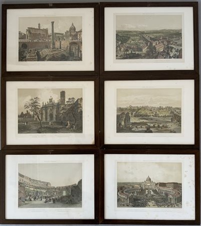 BENOIST Felix. Gruppo di dodici litografie a colori raffiguranti vedute romane tratte da "Rome dans sa Grandeur" edite a Parigi nel 1870 da Henri Charpentier e incise da Benoist (fogli cm 36x50), in cornici (difetti).