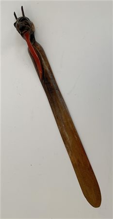Tagliacarte in legno con presa intagliata a guisa di demone a tutto tondo (h. cm 45,5) (difetti)