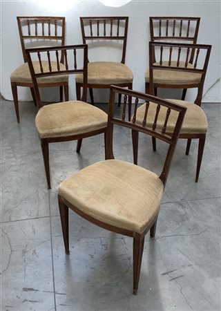 Gruppo di sei sedie in legno con profili unghiati e schienali a giorno con listelli torniti, sedute rivestite in velluto color senape (difetti e restauri)