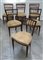 Gruppo di sei sedie in legno con profili unghiati e schienali a giorno con list