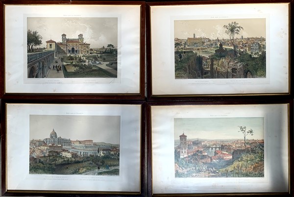 Gruppo di dieci litografie a colori raffiguranti monumenti e scorci romani, in cornice (fogli cm 37x54) (difetti)