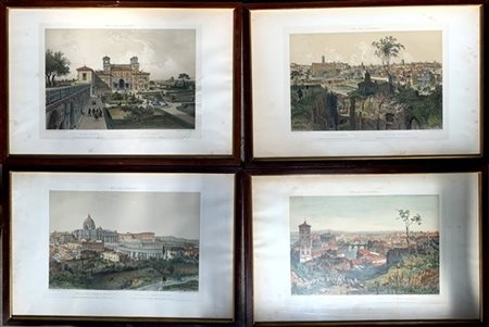 Gruppo di dieci litografie a colori raffiguranti monumenti e scorci romani, in