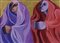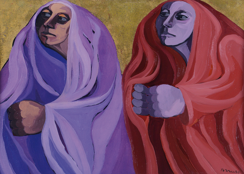 SAVERIO TERRUSO Monreale (Pa) 11/01/1939 - Milano 03/03/2003 Oranti olio su tavola cm. 50x70, firma in basso a destra, firma, titolo e timbro della Galleria Sant'Erasmo Club (MI) al retro, dichiarazione d'autenticità dell'artista su foto.