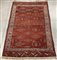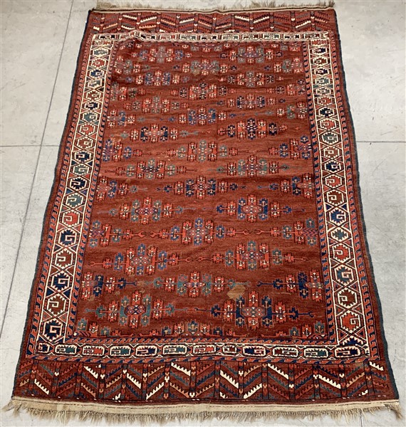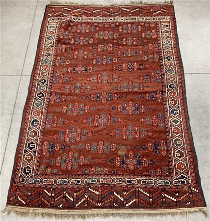 Tappeto Yomut, Turkestan occidentale, fine secolo XIX. Decoro con Gül inseriti in medaglioncini romboidali nei toni del verde, azzurro, bianco e rosso su fondo bordeaux chiaro. Bordura a G in policromia su fondo bianco, testate con alberi della vita. (difetti, vecchi restauri, rapature e mancanze) (cm 270x170)