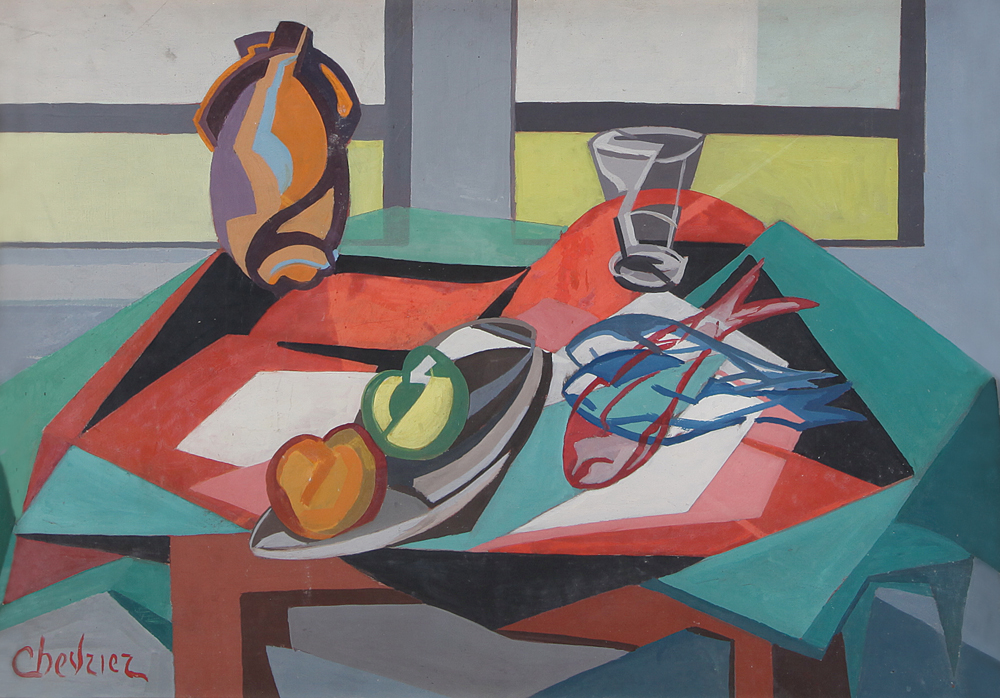 FERDINANDO CHEVRIER Livorno 1920 - 2006 Natura morta, 1948 olio su masonite cm. 51x73, firma in basso a sinistra, firma, anno e dichiarazione d'autenticità dell'artista datata 1999 al retro, dichiarazione d'autenticità dell'artista su foto, pubblicato sul catalogo della mostra "Ferdinando Chevrier, vivere l'immaginario", tenutasi presso il Palazzo Bottini Dell'Olio (LI) dal 21 novembre 2002 al 2 febbraio 2003, pagina 19.