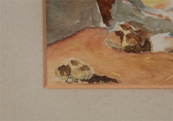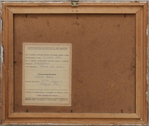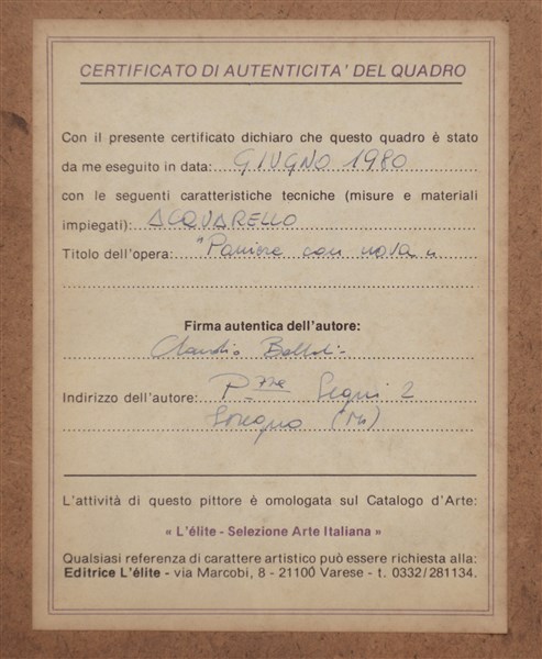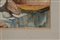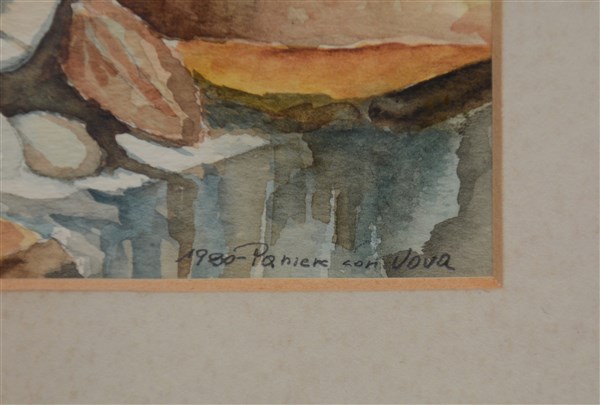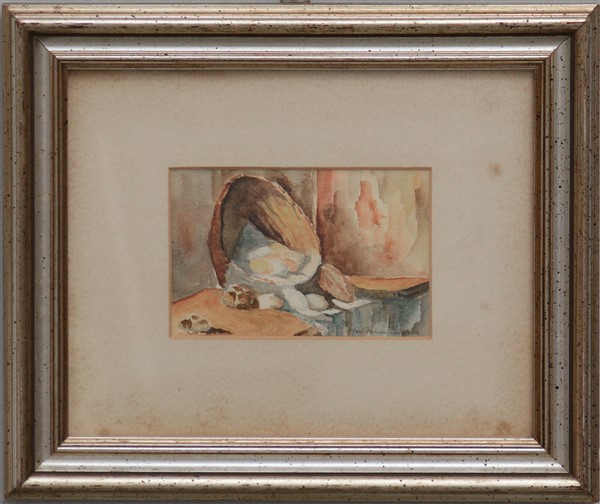 "Paniere con uova" acquerello su carta (cm 10x14.5) Firmato in basso a sinistra, datato 1980 e titolato in basso a destra. Al retro: cartiglio con certificato di autenticità. In cornice