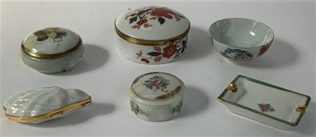Lotto composto da sei oggetti diversi in porcellana e ceramica policrome (difet