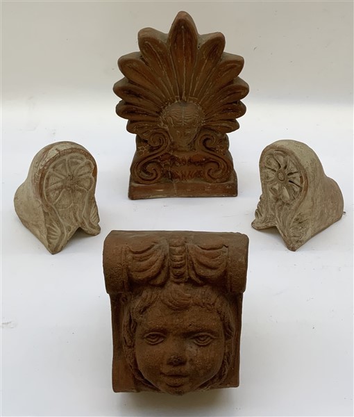 Lotto di quattro elementi ornamentali in terracotta decorati con mascheroni ed