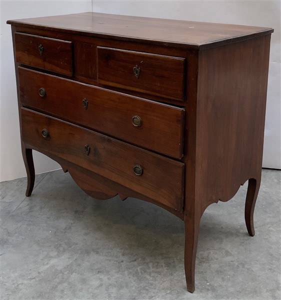 Comò in noce a due cassetti grandi e due piccoli, con gambe e grembiale mosso. Fine secolo XVIII (cm 124x103x58) (difetti e restauri)