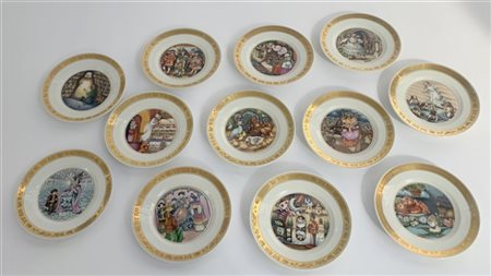Manifattura Royal Copenhagen "The Hans Christian Andersen Plates", gruppo di dodici piatti in porcellana policroma decorati a scene fiabesche nel cavetto (d. cm 19) (lievi difetti)