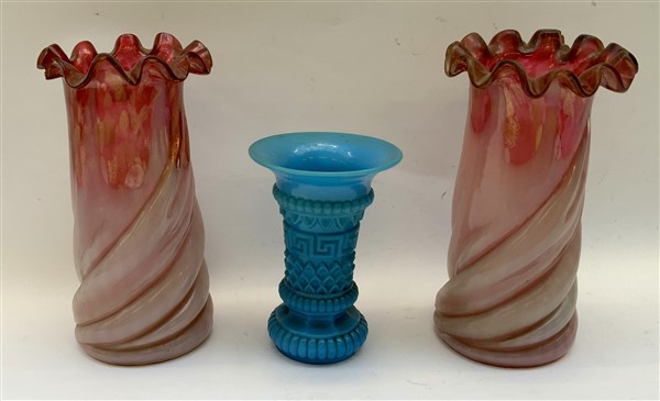 Lotto composto da una coppia di vasetti in vetro rosa con corpo a torchon e un vasetto in opaline del secolo XIX. (difetti)