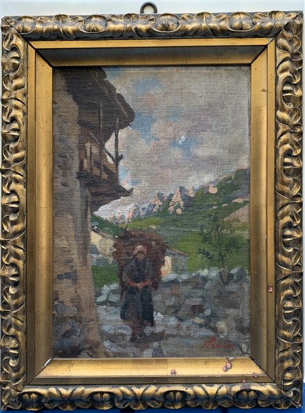 Firma indecifrata "Contadina" olio su cartone telato (cm 25x35) Firmato in basso a destra. In cornice