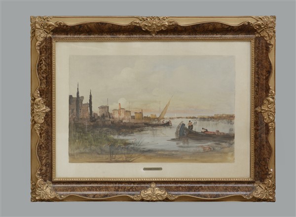 "Scorcio con barche" monotipo su carta (cm 50x70) firmato in basso a sinistra, in cornice intagliata e dorata