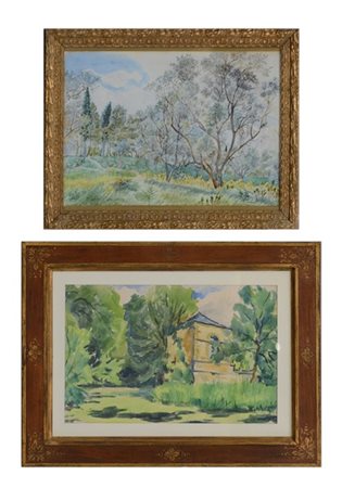 Lotto di due acquerelli raffiguranti "Paesaggi boschivi" autori e misure differ