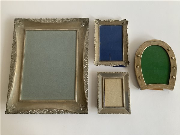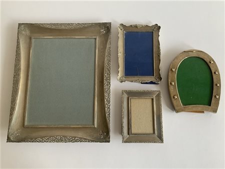 Lotto composto da tre cornici in argento con bordi cesellati e traforati ed una in argento a forma di ferro di cavallo, misure differenti (g. 800) (lievi difetti)
