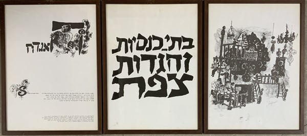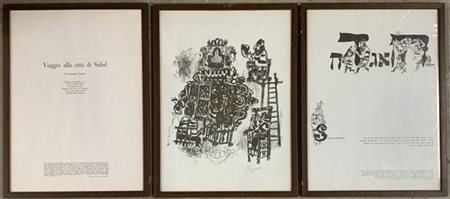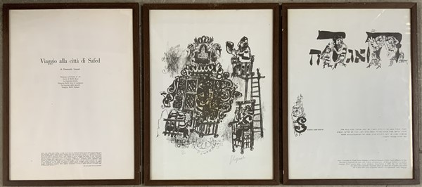 Emanuele Luzzati, lotto composto da parte dell'opera "Viaggio alla città di Safed" sei fogli così composti: uno con indice dei titoli, due con testo bilingue e illustrazioni, due con litografie originali monocrome numerate e firmate e una litografia con iscrizione ebraica (cm 44x32) in cornici