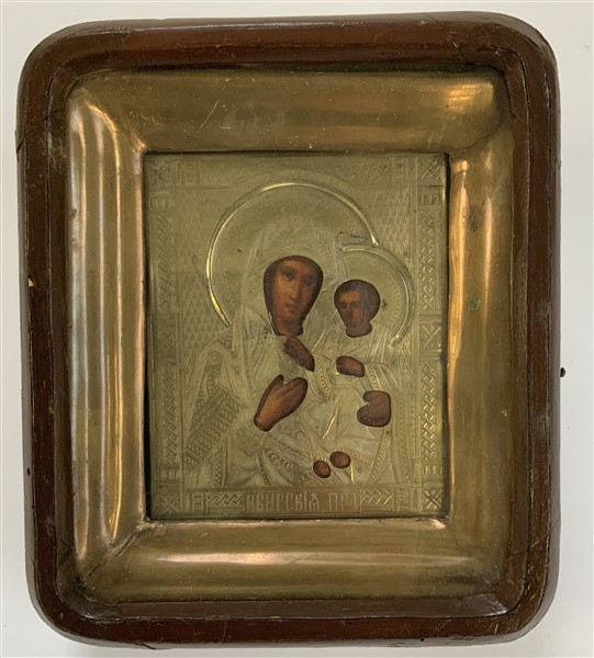 Icona ad olio su tavola raffigurante madonna con bambino, con riza in metallo d