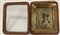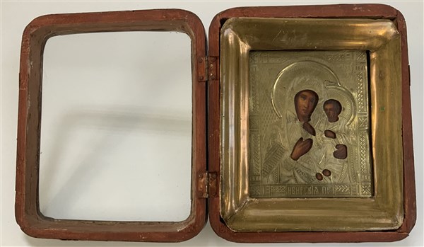 Icona ad olio su tavola raffigurante madonna con bambino, con riza in metallo dorato (cm 13x11) In cornice in legno dorato. Entro teca in legno con coperchio in vetro (difetti)