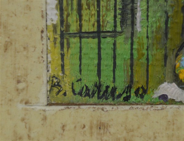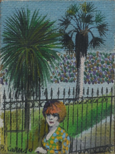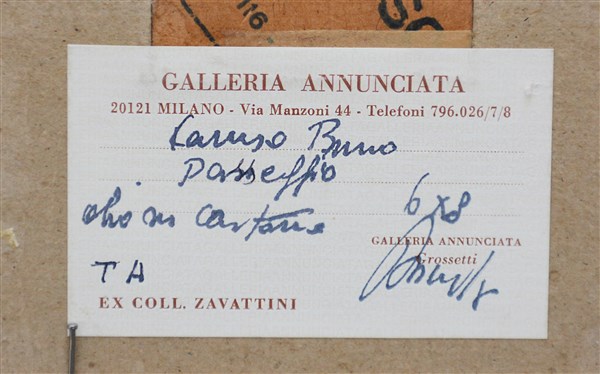 Bruno Caruso "Passeggio" inizi anni '70 olio su cartone cm 8x6 firmato in basso