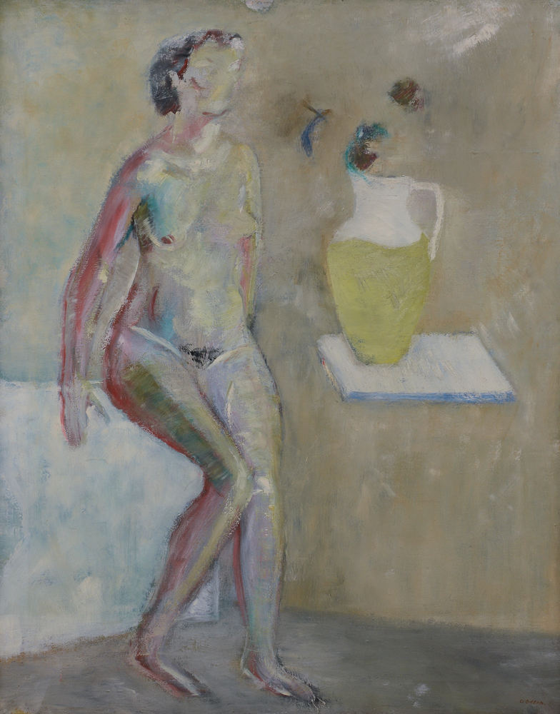 ANGELO DEL BON Milano 12/04/1898 - Desio (Mi) 02/04/1952 Figura e anfora, 1947 olio su tela cm. 92x73, firma in basso a destra, etichette della Galleria Annunciata (MI) e della Galleria Il Chiostro (Saronno) al retro, pubblicato su Del Bon tutte le opere, volume terzo 1945-1952, a cura di Massimo Carrà e Giuseppe Marchiori, Giulio Bolaffi Editore, pagina 657 con tavola a colori. Mostre: -1958 Commemorativa Galleria del Libraio, Bologna. -1963 "10 anni dalla morte" Galleria Annunciata, Milano.