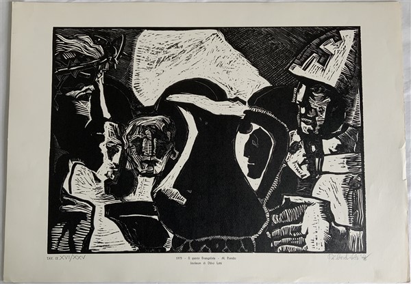 Dilvo Lotti "1975 - Il quinto Evangelista - M. Pomilio" 1976 Linoleum cm 49,5x69
