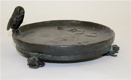 scultura - multiplo in bronzo raffigurante civetta ai bordi di uno stagno
