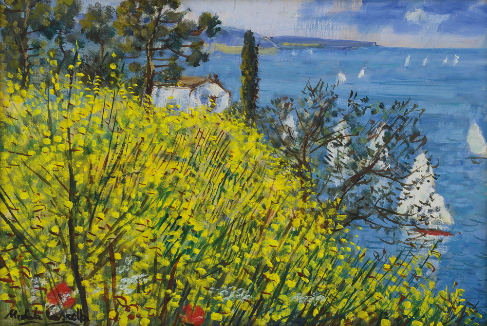 MICHELE CASCELLA Ortona (Ch) 07/09/1892 - Milano 27/08/1989 Ginestre in riva al mare, 1984 ca. olio su tela cm. 40x60, firma in basso a sinistra e al retro, dichiarazione d'autenticità dell'artista su foto, opera registrata presso l'Archivio Michele Cascella a cura della Torcular (MI) come da certificato e foto allegata.