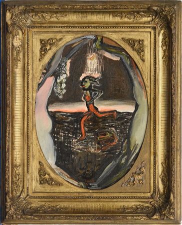 firmato e datato in basso al centro; titolato, firmato e datato al retro. In cornice in legno e pastiglia dorata (lievi difetti)