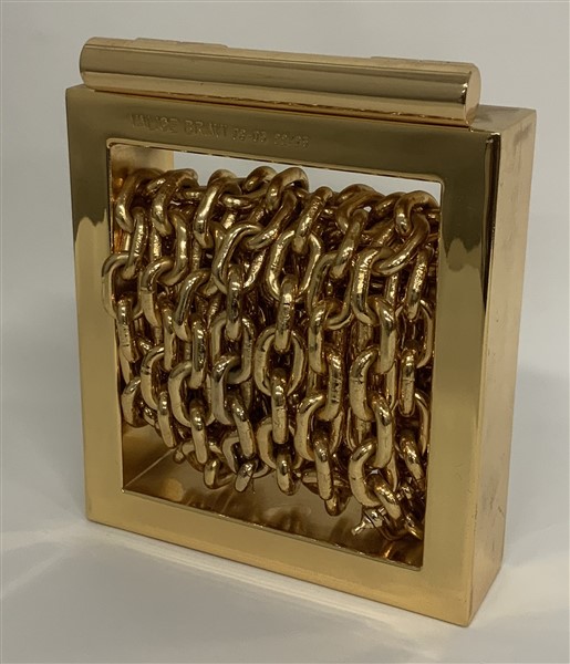 Ignoto Multiplo in bronzo dorato cm 19x17,5x5 iscritto "Valigie Bravi 73-05" e n