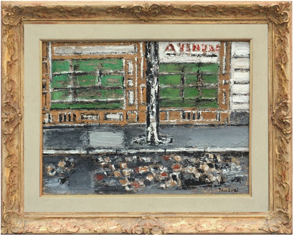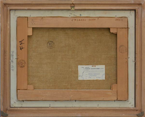 Orfeo Tamburi "L'albero e la bottega" 1972 olio su tela cm 31x41 firmato in bass