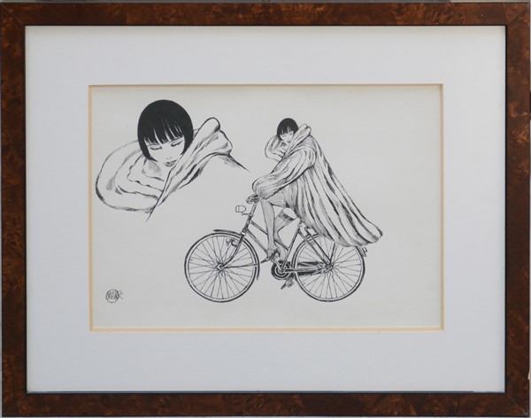 Guido Crepax "Valentina con pelliccia in bicicletta" china e matita su carta cm