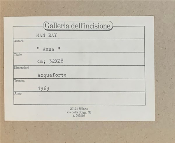 Man Ray "Anna" 1970 acquaforte (lastra cm 32x27,5; foglio cm 66x50) numerata E.A
