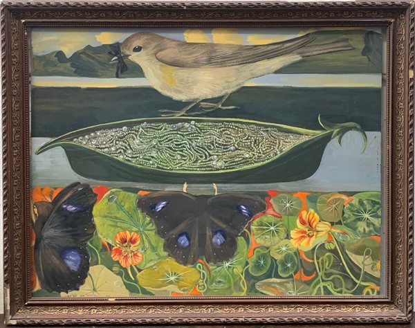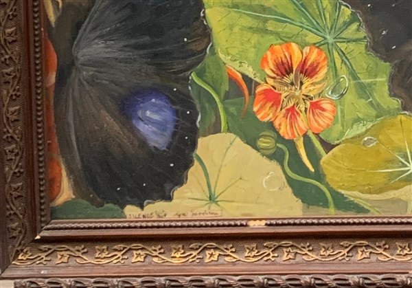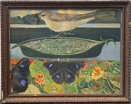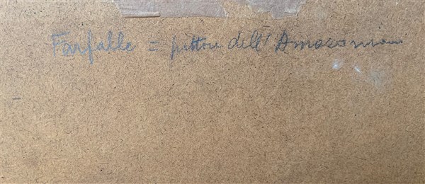 firmato e titolato in basso a sinistra; iscritto a retro "Farfalle = pitture dell'Amazzonia". In cornice (difetti)