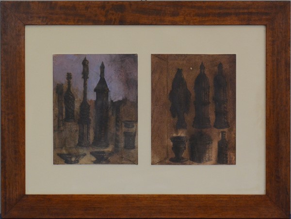 2 disegni/ schizzi a tecnica mista su carta di soggetti diversi, montati in un'unica cornice