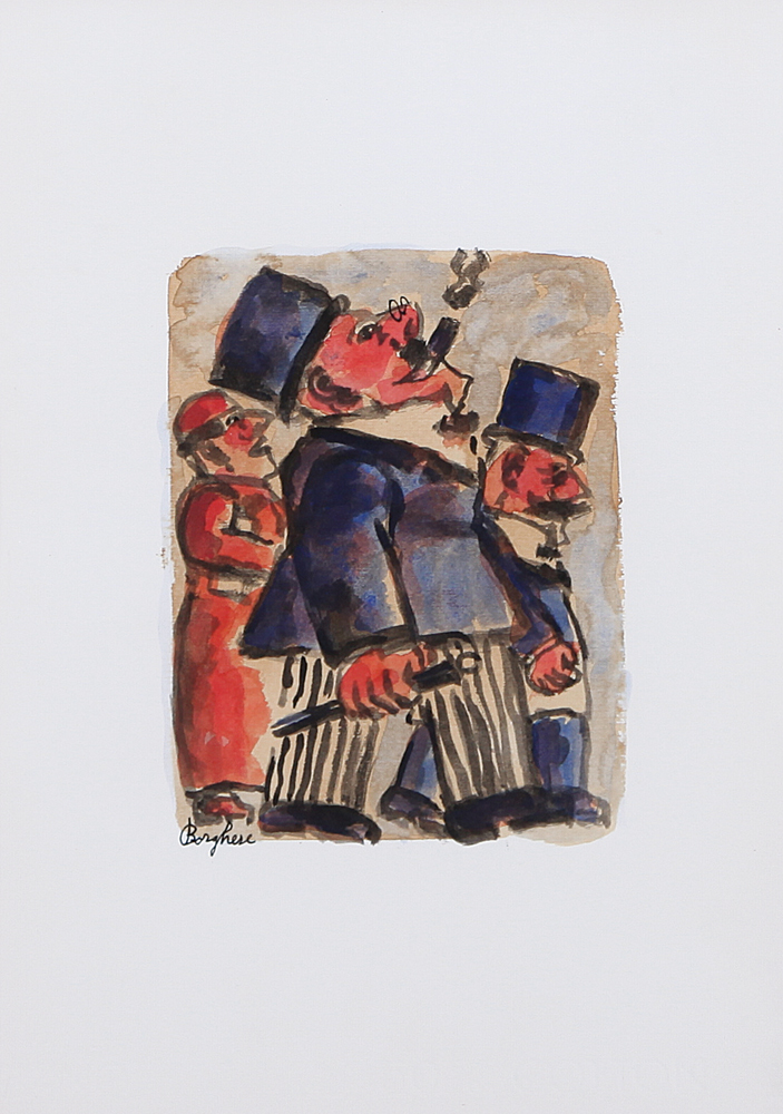 FRANZ BORGHESE Roma 21/01/1941 - Roma 17/12/2005 Passeggiata borghese acquerello su cartoncino cm. 50x35, firma in basso a sinistra, dichiarazione d'autenticità dell'artista su foto.