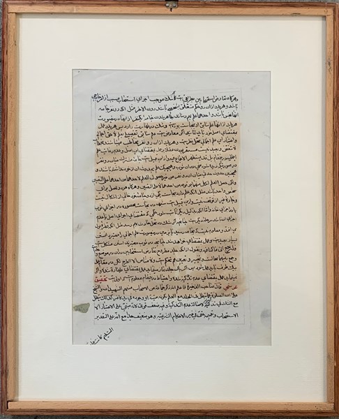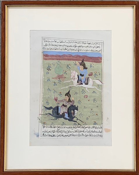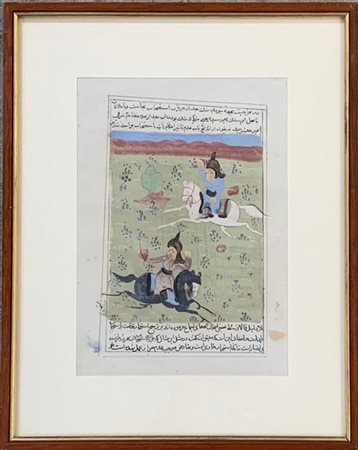 Pagina in arabo con una miniatura raffigurante una scena di combattimento, in cornice (difetti)