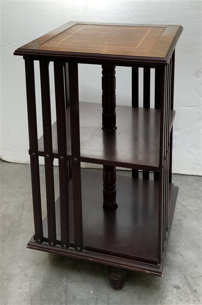 Libreria girevole inglese a due ripiani con divisori a listelli, piano con inserto in simil pelle (cm 49x87x49) (difetti)